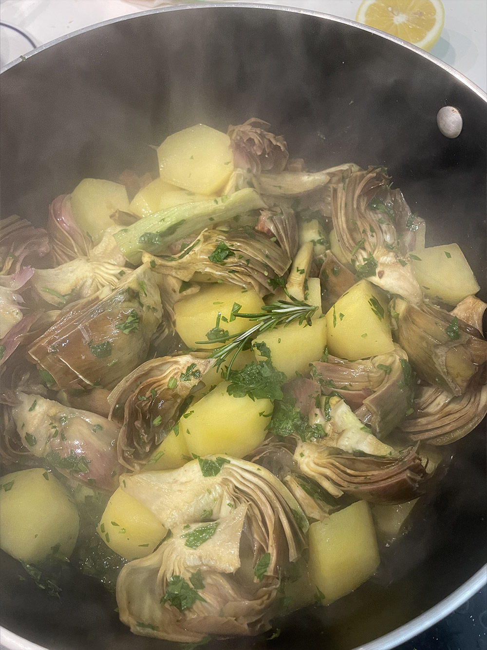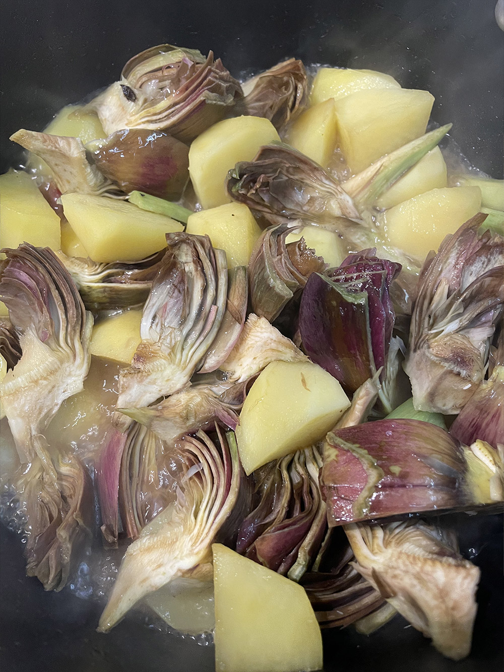Quando il guanciale è pronto aggiungere le patate e i carciofi nella casseruola e mescolare, versare il vino, mettere il fuoco alto e lasciare evaporare l'alcool.