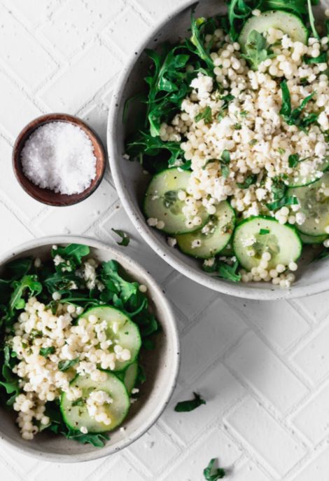 Insalata di rucola con couscous, cetrioli e feta al limone