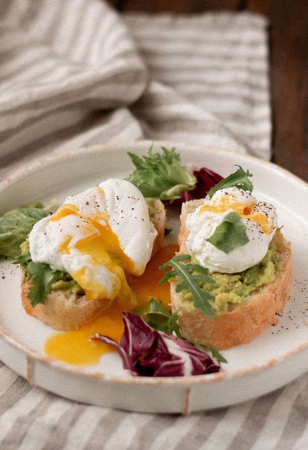 Posare il pane tostato in un piatto di portata, poi spalmarlo con l'avocado condito, mettere qualche foglia di rucola e appoggiare le uova cotte in camicia.